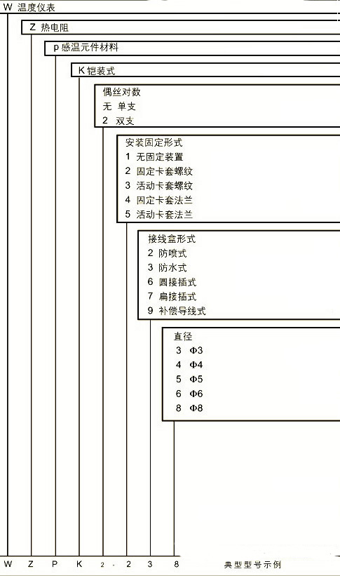 分度代號溫度范圍℃精度等級安裝固定裝置WZPK-133Pt100-200-+500A級或b級無固定裝置wzpk-134 wzpk-135 wzpk-136 wzpk-138 wzpk2- 135 wzpk2- 136 wzpk2- 138 wzpk-233固定螺紋件wzpk-134 k-238 wzpk2- 234 wzpk2- 235 wzpk2- 236 wzpk-238 wzpk-333可動鎖緊螺釘wzpk-335 wzpk-336 wzpk2- 335 wzpk2- 336 wzpk2- 338 wzpk-433固定鎖緊凸緣wzpk wzpk-438 wzpk2- 435 wzpk2- 436 wzpk2- 438 wzpk-533可動咬合凸緣wzpk-534 wzpk-535 wzpk-536 wzpk-538 wzpk2- 534 wzpk2- 535 wzpk2- 536 wzpk2- 5382 )防噴流式